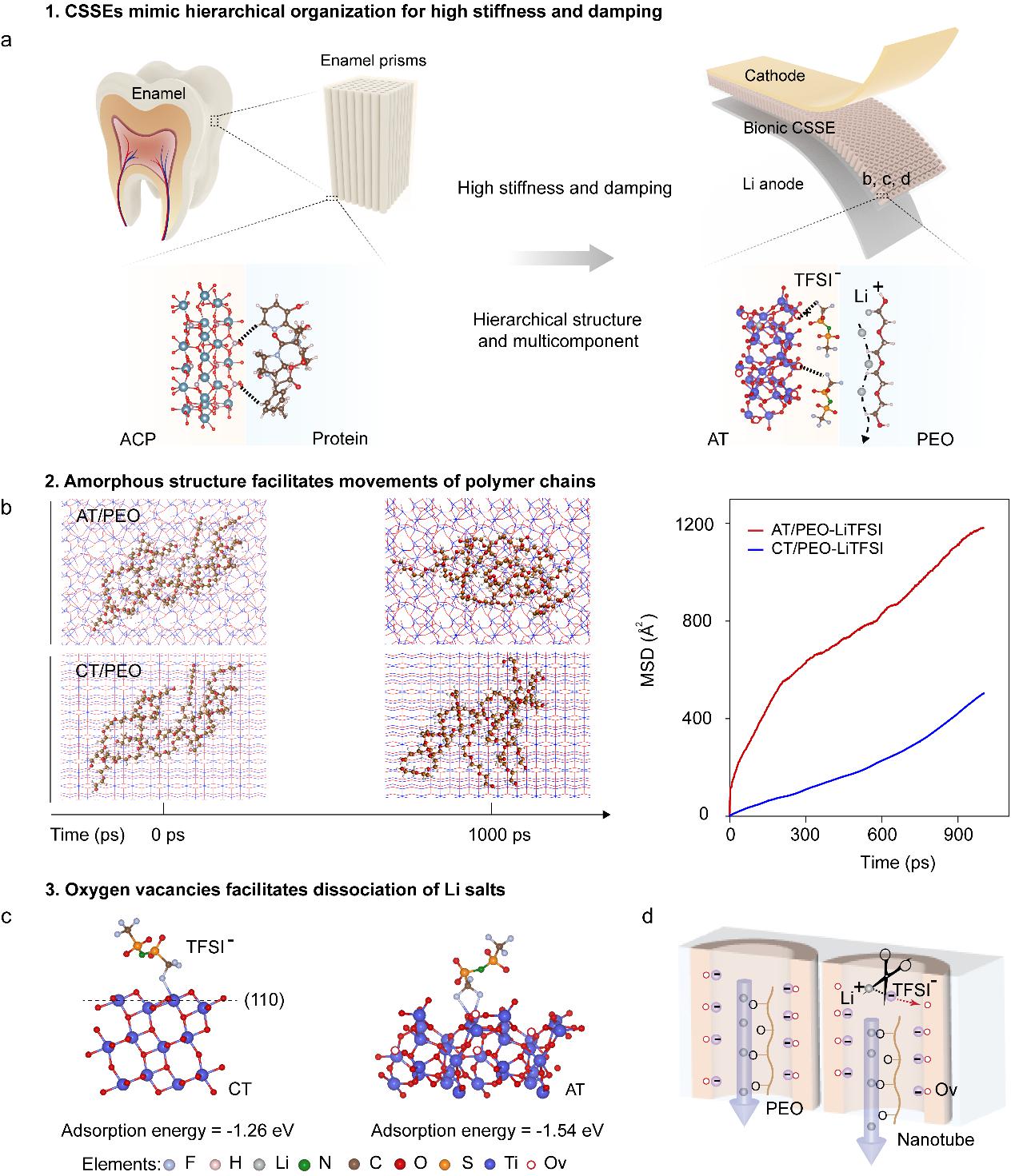近日,PA真人 赵婕课题组和化学系李伟课题组在Angewandte Chemie期刊上合作发表了题为“Multiscale Engineered Bionic Solid-State Electrolytes Breaking the Stiffness-Damping Trade-Off”的研究论文。研究团队受牙釉质超结构的启发,设计并开发出一种由非晶TiO2纳米管阵列与聚合物电解质PEO交织而成的仿生复合固态电解质,实现了高刚度(杨氏模量达15 GPa,硬度为0.13 GPa)和优异的阻尼性能(tanδ=0.08),成功解决了传统固态电解质中刚度与阻尼难以兼顾的问题。一方面,这种电解质拥有媲美无机固态电解质的刚度,可有效抑制锂枝晶的生长;另一方面,其阻尼性能接近于聚合物固态电解质,确保了与电极的紧密接触。