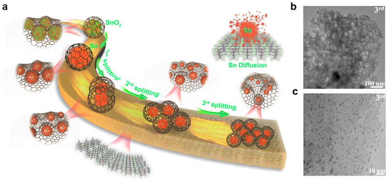 图1. (a)锡颗粒在石墨碳基体中通过热处理展现的分裂行为示意图;(b-c)锡/碳复合材料的透射电镜图
