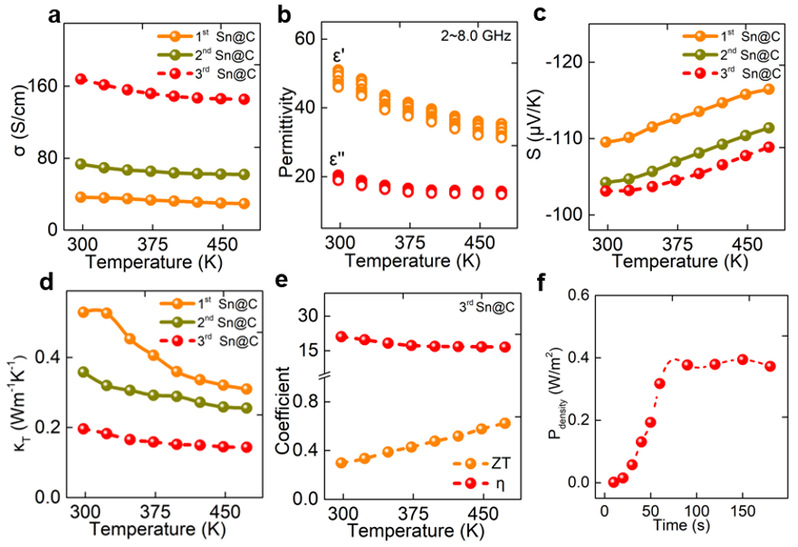 图2. 锡/碳复合材料的(a)电导率,(b)介电常数,(c)赛贝克系数,(d)热导率,(e)耦合的电磁波-热-电性能;(f)电磁波-电能收集体受微波辐射后输出的功率密度