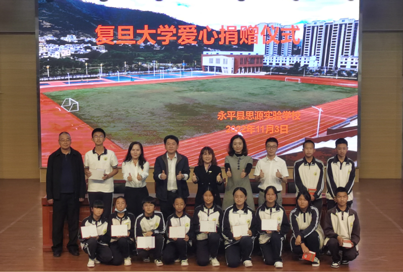 俞燕蕾一行先后来到永平县思源实验学校、曲硐完小和永平一中,对教育帮扶情况进行实地调研,分别举行了复旦大学爱心捐赠仪式。仪式上调研组为三所学校捐赠了价值近两万元的现代汉语词典300册、科普读物200册及校名衫100件。