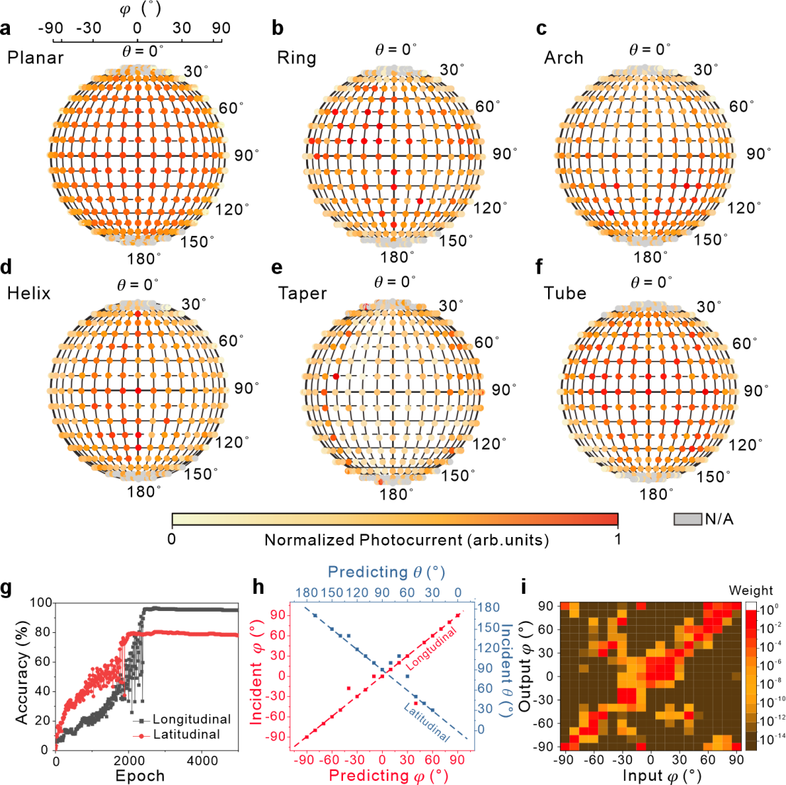 图2 (a)平面,(b)环状,(c)拱状,(d)螺旋形,(e)锥形与(f)管状光探测器的三维入射光响应;(g)深度神经网络在三维空间经度与纬度方向的训练集识别精确率;(h)在经度(= 0°)和纬度(= 40°)方向上的入射角的角度识别;(i)在经度(= 0°)方向上的入射角权重分布图。