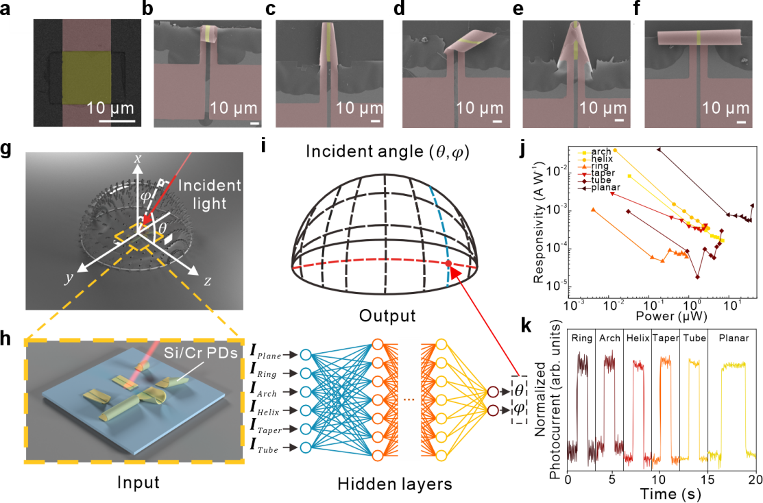 图1 (a)平面,(b)环状,(c)拱状,(d)螺旋形,(e)锥形与(f)管状光探测器;(g)三维入射光角度控制装置与位于其中心的(h)纳米薄膜组装结构光探测器示意图;(i)神经网络辅助的三维入射光空间定位示意图;三维光探测器的(j)响应率与(k)响应时间。
