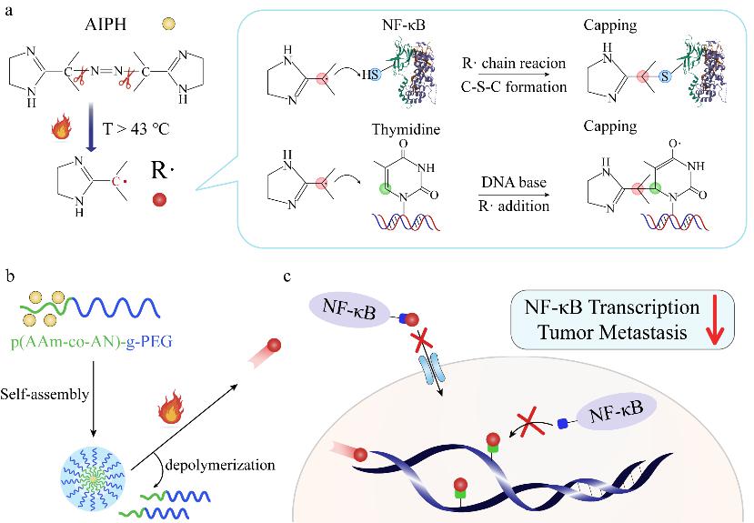近日,PA真人 /聚合物分子工程国家重点实验室步文博教授、澳大利亚悉尼科技大学/宁波东方理工大学(筹)金大勇院士和复旦大学附属肿瘤医院何新红主任医师的合作团队,受启发于高分子化学经典的封端反应,首次提出了自由基封端转录因子的抗肿瘤新策略,巧妙利用逆向思维,通过自由基生化反应封闭转录因子活性位点,创新性实现了肿瘤细胞内转录因子NF-κB的高效抑制(图1)。该工作构建了装载碳自由基前体分子(AIPH)的热敏纳米胶束,经癌细胞内吞和低热处理(43°C)后,可快速在癌细胞内解组装并释放AIPH,通过持续热分解生成碳自由基(R∙),完成癌细胞内R∙精准递送。该研究创新性揭示了碳自由基的生化反应新机制:R∙可以通过自由基亲电加成反应与核酸碱基的双键结合,还可以通过自由基链式反应与NF-κB中的巯基结合形成C-S键(图2)。通过封端这两个关键位点,可同时抑制NF-κB核转位和NF-κB-DNA结合,NF-κB转录总抑制率高达94.1%(图3)。
