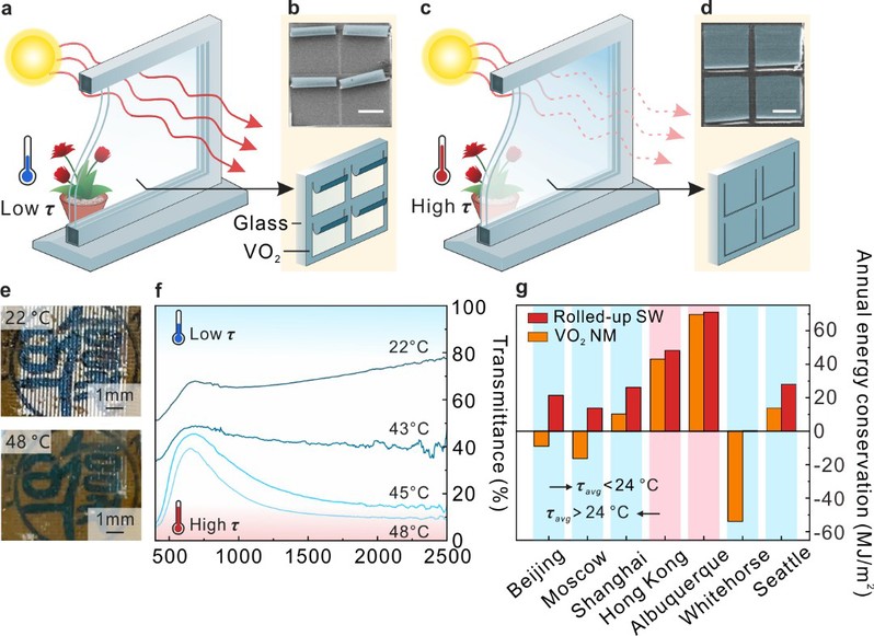 研究团队发展的卷曲智能窗在可见到近红外波段实现了随温度改变的多级太阳光透过率调制(e和f),并得到极高的太阳光调制率(42.14%)和可见光透过率(61.01%),这使得该智能窗具备了在不同温度,不同气候,不同时段高效自适应调节室内温度的能力。研究团队利用全球气候数据库与模拟软件,对不同气候类型的典型城市中装配卷曲智能窗、平面薄膜智能窗与普通玻璃的房屋进行了全年能耗(包括照明、供暖和制冷)的模拟(g),由于卷曲智能窗具有比较高的太阳光调制率以及低温下良好的太阳光透过率,无论在常年炎热的环境还是四季严寒的环境,都具有比较优异的节能效果。该工作将智能二氧化钒薄膜材料的热致形变能力与热致色变能力创造性地结合在一起,突破了传统平面薄膜难以兼顾透光率、节能效率和多环境适应性的难点,为新一代的高效智能窗提供了一种新的可行性思路。