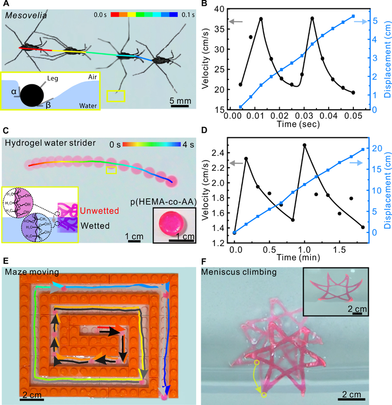 图1.水黾在水面运动的照片(A),运动机理示意图(图A左下角插图)和它运动速率和位移随时间的变化规律(B);活性水凝胶水黾在水面运动的照片和轨迹图(C),运动机理示意图(图C左下角插图)和它运动速率和位移随时间的变化规律(D);活性水凝胶水黾在有水的迷宫的水面自发找到出口的运动轨迹照片(E);刺激响应性活性水凝胶水黾在受到pH刺激变形后靠岸行为的运动轨迹照片(F)及靠岸后的侧视照片(图F右上角插图)。