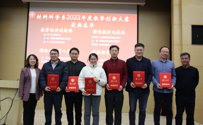 在致谢与表彰环节,于瀛代表系党委向2022年疫情防控工作中主动进校值守的教师们致谢,同时对全系教师2022年勠力同心、共谋发展表示了感谢。蒋益明宣读了2022年教学创新大赛获奖名单,于瀛、俞燕蕾为获奖青年教师颁发荣誉证书,并籍此鼓励全体教师要在党的二十大精神指引下,将“以中国式现代化全面推进中华民族伟大复兴”的思想融入课堂,结合材料学科专业特色与国际科技发展前沿,创新教学方式方法,为国家培养时代新人,支撑科技自立自强。