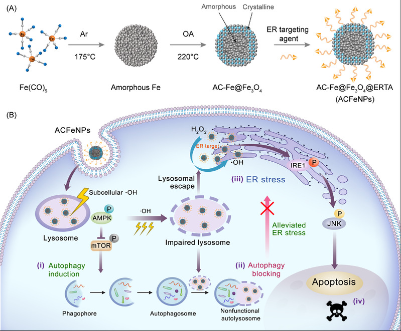 近日,PA真人 /聚合物分子工程国家重点实验室步文博教授与复旦大学基础医学院吴健教授、复旦大学附属华山医院姚振威教授的合作团队,在国际核心学术期刊Advanced Materials 上发表研究论文,首次提出了细胞器时空通讯拦截的创新策略用于肿瘤化学动力学疗法(Chemodynamic Therapy,CDT),揭示了其治疗肿瘤的生物学新机制。研究人员设计合成了一种由高活性非晶Fe内核和化学稳定性晶化Fe3O4外壳层构成的Fe@Fe3O4纳米颗粒作为纳迷拦 截 器(ACFeNPs)。ACFeNPs的特殊核壳结构赋予其具备持续高效催化非均相Fenton反应的特性,产生的羟基自由基(•OH)及其作用位点与材料在细胞内的时空转运特性和轨迹精准吻合。ACFeNPs被癌细胞内吞后,首先进入酸性溶酶体腔室并催化过氧化氢(H2O2)产生羟基自由基,通过激活AMPK/mTOR信号通路而启动自噬系统;随后,羟基自由基利用其强氧化性损伤溶酶体,诱导肿瘤细胞内功能失调性自噬溶酶体的形成,进而阻断了自噬流;而逃逸出溶酶体的ACFeNPs可靶向内质网,通过催化生成羟基自由基,进而诱导内质网应激,由于溶酶体自噬流的预先阻断,导致大量积累有毒蛋白和受损内质网无法得到及时清除和修复,最终高效激活内质网应激相关IRE1/JNK凋亡信号通路诱导癌细胞死亡。该研究利用纳米材料在癌细胞内的时空转运特性,通过时空序惯性的方式高效阻断了溶酶体与内质网之间的通讯,从而在癌细胞和荷瘤鼠活体上实现了高效的肿瘤CDT治疗。