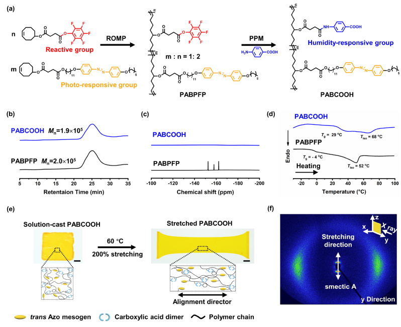 近日,PA真人 俞燕蕾教授团队从合成策略和分子设计的角度出发,首次结合开环易位聚合(Ring-Opening Metathesis Polymerization, ROMP)与PPM以制备多功能液晶聚合物(图1a)。通过ROMP可以得到高分子量反应性线型液晶聚合物前驱体PABPFP(图1b),使其无需交联即可展现出良好的力学强度以及光致形变能力。同时,借助PPM在前驱体反应性位点上精确引入所需功能基团,为响应性液晶聚合物的多功能化衍生提供便捷的制备途径。该团队利用这种通用型策略制备了可回收光湿双响应线型液晶聚合物(PABCOOH),并通过机械热拉伸法制备得到了具有良好液晶取向的薄膜材料(图1e,f)。