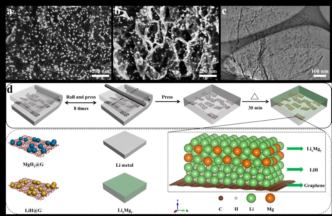 图1. (a-c) MgH2@G的形貌分析,(d) LiMg-LiH@G的制备过程示意图。
