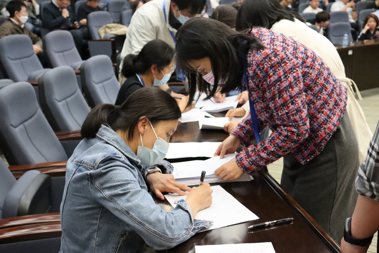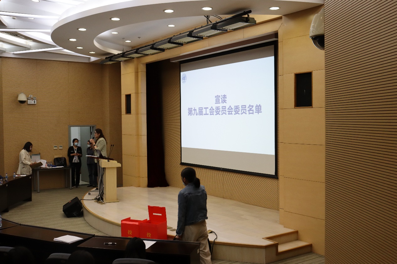 随后进入会议第二项议程。于瀛宣读了第九届工会委员会委员候选人名单和选举工作小组名单,并简要介绍了本次工会换届选举的程序和办法。本次选举以无记名投票方式进行,从11位候选人中差额选举出9位新一届工会委员会委员。在座所有工会会员鼓掌通过后,选举工作小组分发选票,会员收到选票后认真地在心仪的候选人名字后面勾选,并依次走向投票箱郑重地投下选票。