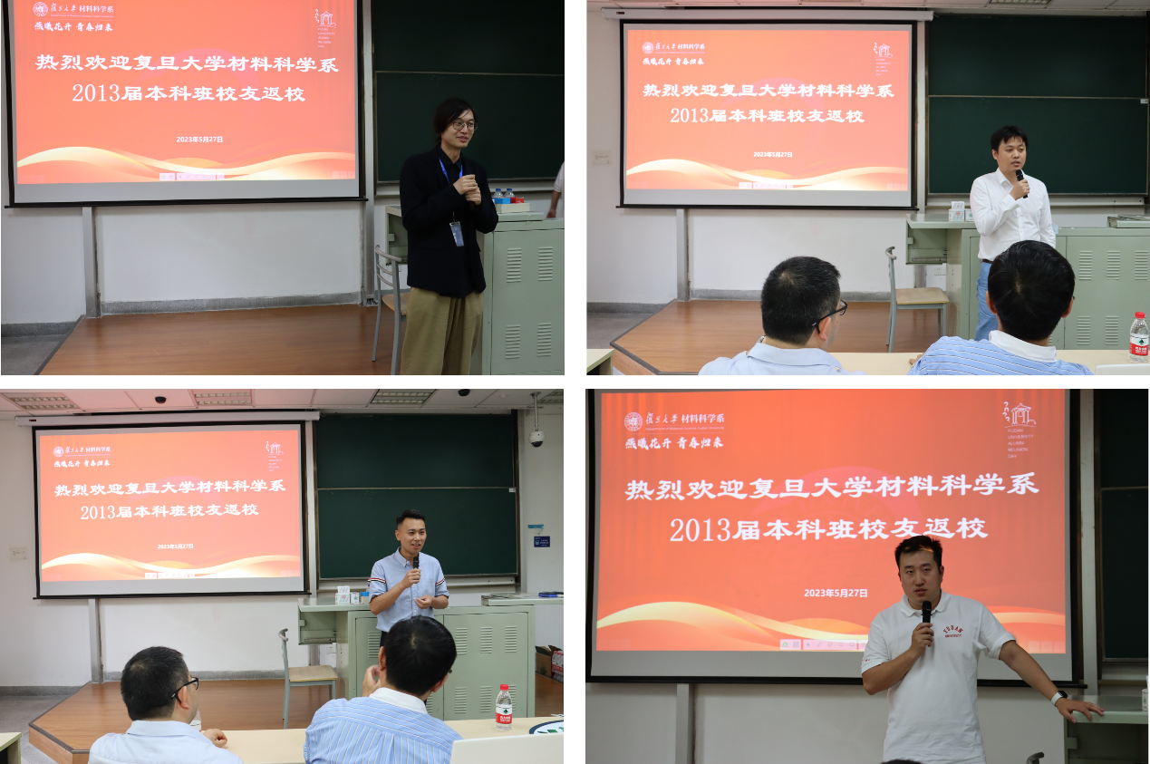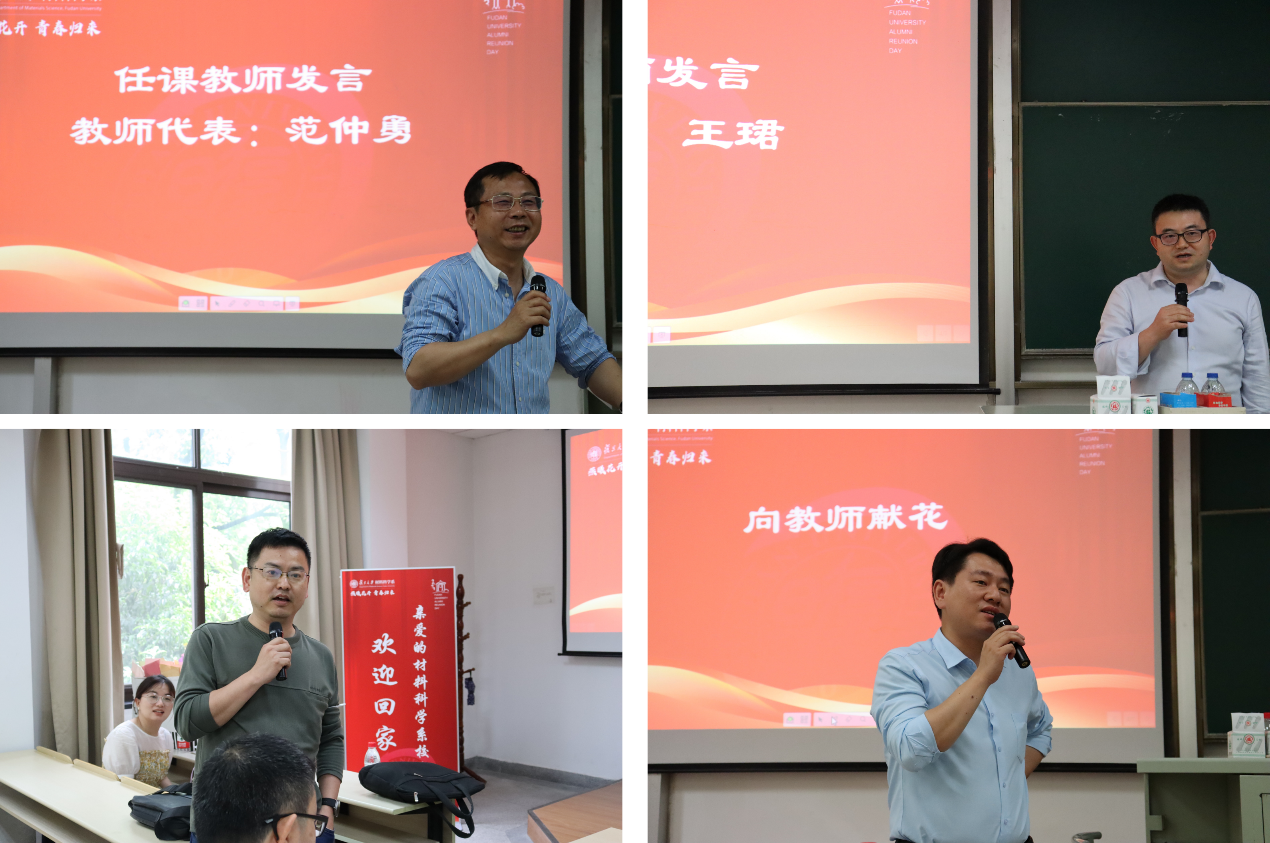 校友们发言结束后,范仲勇老师和王珺老师作为任课教师代表致辞。范仲勇老师曾给13届校友们上过《高分子物理》,王珺老师上过《数学物理方法》。毕业多年,校友们仍对两位老师当时的授课场景印象深刻,返回母校,他们表示也想见见这两位老师,以表达对他们当年殷切教导的感激之情。范老师和王老师表示,每位校友在各行各业的发展和成就值得欣慰,希望大家常回家看看,牢记“相聚是缘,材料是家”,鼓励大家作为复旦的学生,在工作中要有信心,同时也要不忘初心,才能在未来的人生中走得更高更远。副系主任倪峰老师和系党委副书记王珏老师也向校友们表达了热烈的欢迎和亲切的问候,并衷心地感谢大家长期以来对PA真人 的关心和支持。