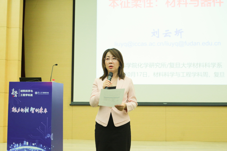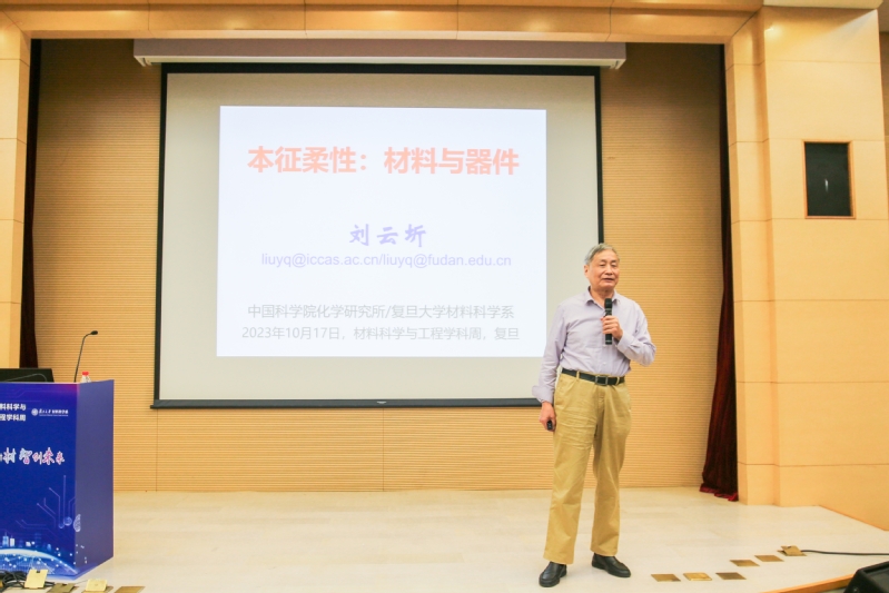 俞主任首先介绍了文化校历和学科周活动开展的背景。在2023级本科新生第一堂思政课上,校党委书记裘新向同学们推荐了“文化校历”——以校历为载体,遴选复旦校园未来一年近400个学术和文化活动,按月份编排,每月都有主题和时令特色,全景式地展现复旦这片育人沃土、学术沃土、文化沃土。作为学校“文化校历”的重要组成部分之一,学校在本学年首次统筹全校44个一级学科,推出29场“学科周”活动,旨在充分发挥学科建设在校园文化建设中的重要作用,让每一位复旦学子都能在卓越而有趣的大学文化当中受到潜移默化、耳濡目染的全面教育。俞主任鼓励同学们积极踊跃参与到学科周活动当中,深化对材料学科的认识,享受学术文化的盛宴。俞主任着重介绍了主讲人刘云圻院士,刘院士在分子材料器件与研究方向深有造诣,特别注重对学生的培养,支持年轻教师的学术工作,教学成果丰厚。俞主任希望在座的材料学子借此机会认真聆听本次讲座内容,体会学术大师的风采的同时,涵养积极进取的学术志向,培养实事求是的学术思辨精神。