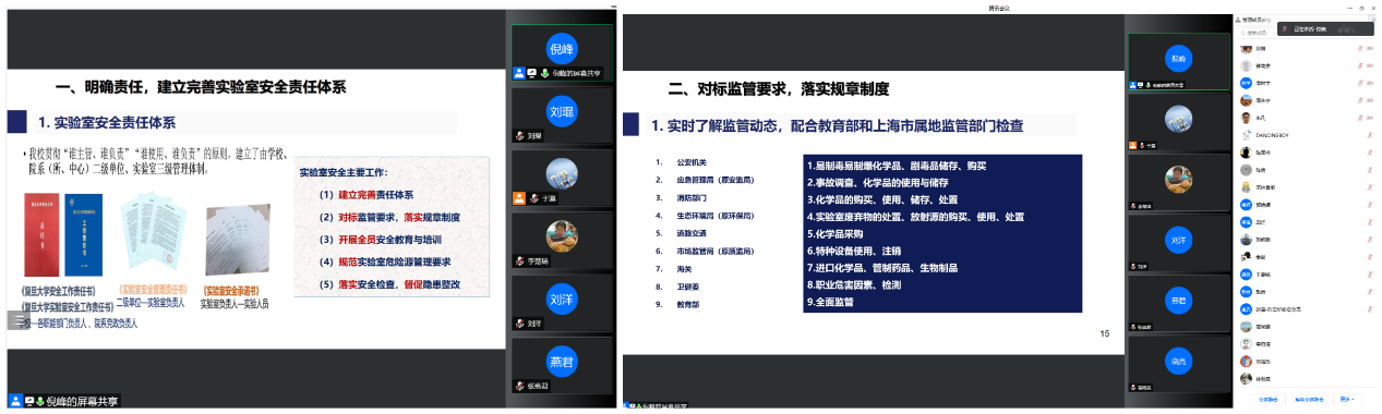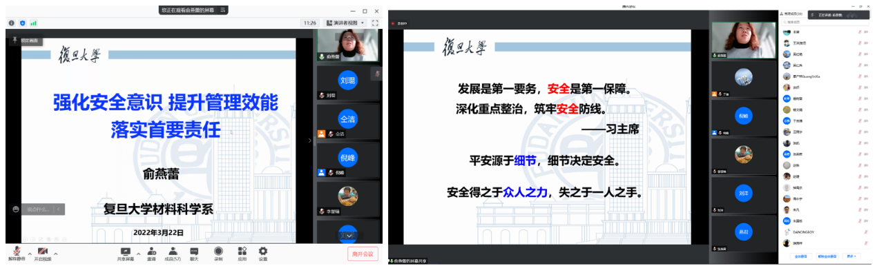 首先,系主任俞燕蕾教授做题为“强化安全意识,提升管理效能,落实首要责任”的专题报告。俞老师从科研团队负责人的角度出发,详尽地介绍了团队在安全意识培养、日常管理措施、药品和仪器管理、废弃物处置、办公环境营造、配合学校监督排查等方面的经验做法。俞老师强调,安全得之于众人之力,失之于一人之手,统筹做好疫情防控和实验室安全管理,深入开展安全教育,帮助学生树立起公众安全健康和社会福祉放在首位的安全理念和价值观。最后她引用习近平总书记的话“发展是第一要务,安全是第一保障”与教师们共勉。