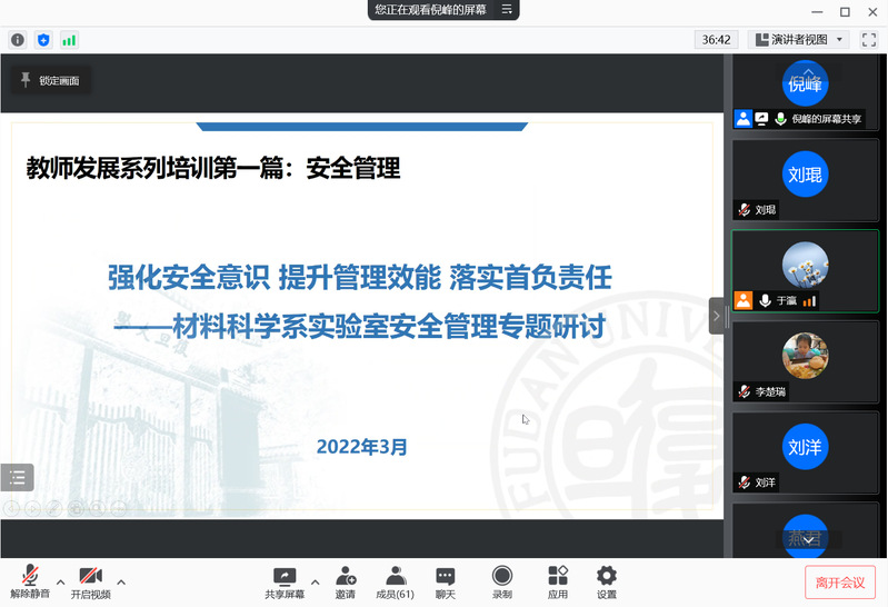 通过线上会议形式举办实验室安全管理专题研讨会。系党政班子、各课题组负责人、青年教师及博士后共60余人参会。研讨会由系党委书记于瀛主持。