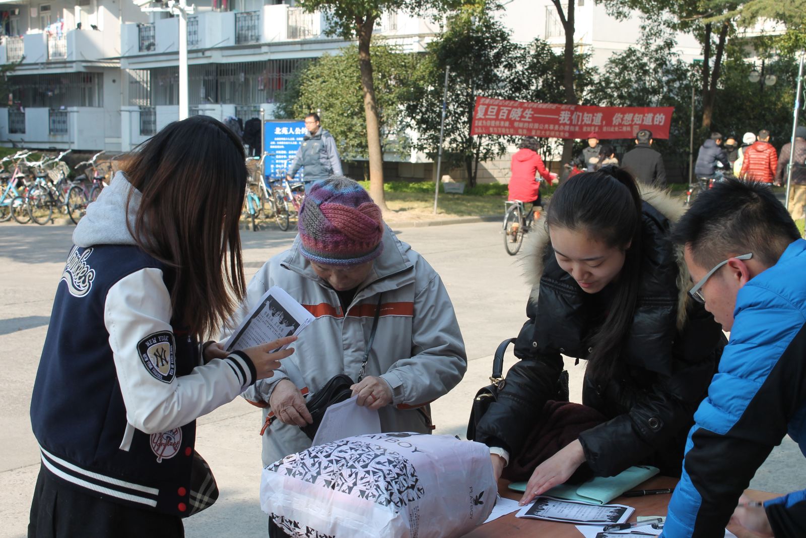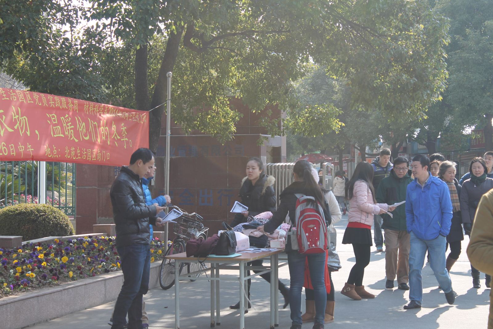 1226日星期五中午,材料系2014级硕士研究生党支部于北区学生公寓门口举办爱心衣物捐赠的党员实践活动。本次活动是由材料系2014级硕士研究生党支部组织进行,支部全体23位党员参加。此次党员实践活动旨在为贫困地区人民募集冬季御寒衣物,同时发扬党员的模范带头作用,号召大家关注贫困地区人民生活状况。