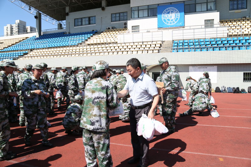 上午九点,系主任孙大林,党委书记包涵,副系主任梅永丰、蒋益明、于瀛,研工组长王珏、学工组长许妍等老师一行,在辅导员秦玉琪的陪同下来到南区训练场。孙大林老师首先代表PA真人 对全体参训同学表示亲切慰问,他夸赞同学们在军训中展现出焕然一新的精神面貌,是“自强的男儿与巾帼不让须眉的女子”,希望同学们将军训看作人生中宝贵的磨练,展现复旦精神、承担国家责任。包涵老师代表PA真人 向军训教官表达了感谢之情,她关切地询问了学生们的状况以及训练的进度。老师们不仅对同学们进行言语的鼓励,还带来了丰富的慰问品。他们心系同学们的身心状况,一再叮嘱同学们当心身体。