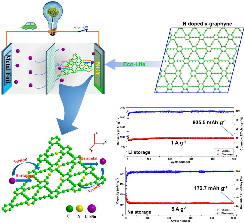 崔晓莉课题组基于机械化学合成方法,以碳化钙和卤代苯为前驱体首次成功制备了γ-石墨单炔(Carbon 2018, 136, 248-254),并将其应用于能源存储与转换领域(Journal of Materials Chemistry A 2018, 6, 20947-20955; Small 2019, 15, 1804710; Journal of Materials Chemistry A 2019, 7, 5981-5990)。前期研究表明,γ-石墨单炔具有良好的储锂性能(1104 mAh g-1,Small 2019, 15, 1804710)。本工作以NH4HCO3为氮源,采用分段升温策略制备了氮掺杂γ-石墨单炔。通过分析材料的形貌演变过程,揭示其独特二维平面结构的形成机制,并拓宽其在碱金属钠离子二次电池中的应用。电化学测试表明,氮掺杂γ-石墨单炔表现出良好的储锂(1037 mAh g-1)和储钠容量(570 mAh g-1)以及高倍率性能,为新型高比能储能材料的研制提供了新思路。