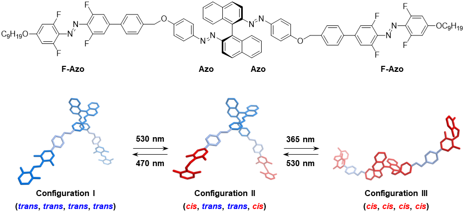 显示“黑色”看似简单,实则需要胆甾相液晶的核心成分——手性分子具有很宽的调控范围,反射波长在保证覆盖整个可见光谱的前提下,进一步延伸至近红外光区域。由于近红外光无法被人的眼睛识别,所以显示出黑色背景。为实现这一目标,研究者精心设计了一种新型三稳态手性分子,巧妙的将两种偶氮苯连接在联萘手性中心上。偶氮苯和含氟偶氮苯在紫外光和蓝光的刺激下均分别发生trans-cis和cis-trans异构化反应。但是,当使用绿光作为刺激源时,偶氮苯由cis回复到trans,含氟偶氮苯却由trans异构化为cis。正是由于两种偶氮苯在这三种光刺激下的异构化反应不尽相同,该手性分子可以产生3种稳定构型,为胆甾相液晶提供2个调控波段。3种构型空间结构存在巨大差异,导致螺旋扭曲力的变化非常大(D = 87%),这为拓宽调控范围奠定了基础。