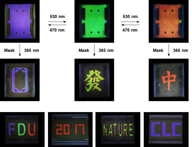 最近,我系俞燕蕾教授课题组突破上述难关,设计开发了一种新型光响应超分子材料——分段调控胆甾相液晶。基于该材料制备的光子晶体具有超宽的颜色调控范围,能够在黑色背景上显示各色图案,甚至在同一个背景上显示不同颜色的图案。研究者别出心裁的将“国粹”麻将图案融入到材料的功能展示过程中,充分体现了科研与生活的完美结合。变色过程分为两步:首先,利用可见光刺激将光子晶体调控到想要的颜色;随后,将刺激光源换成紫外光,再结合各式各样的掩膜版,就能得到“黑底彩图”,操作起来非常简单易行。之所以选择光作为刺激源,俞燕蕾教授表示,光是一种清洁能源,并且在远程、精确、定点控制上具有得天独厚的优势,我们一直致力于“让液晶材料随光起舞”。