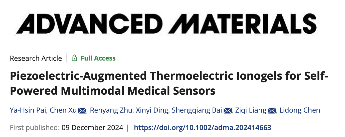 Ya-Hsin Pai, Chen Xu, Renyang Zhu, Xinyi Ding, Shengqiang Bai, Ziqi Liang, Lidong Chen, Piezoelectric-Augmented Thermoelectric Ionogels for Self-Powered Multimodal Medical Sensors. Adv. Mater. 2024, 2414663.