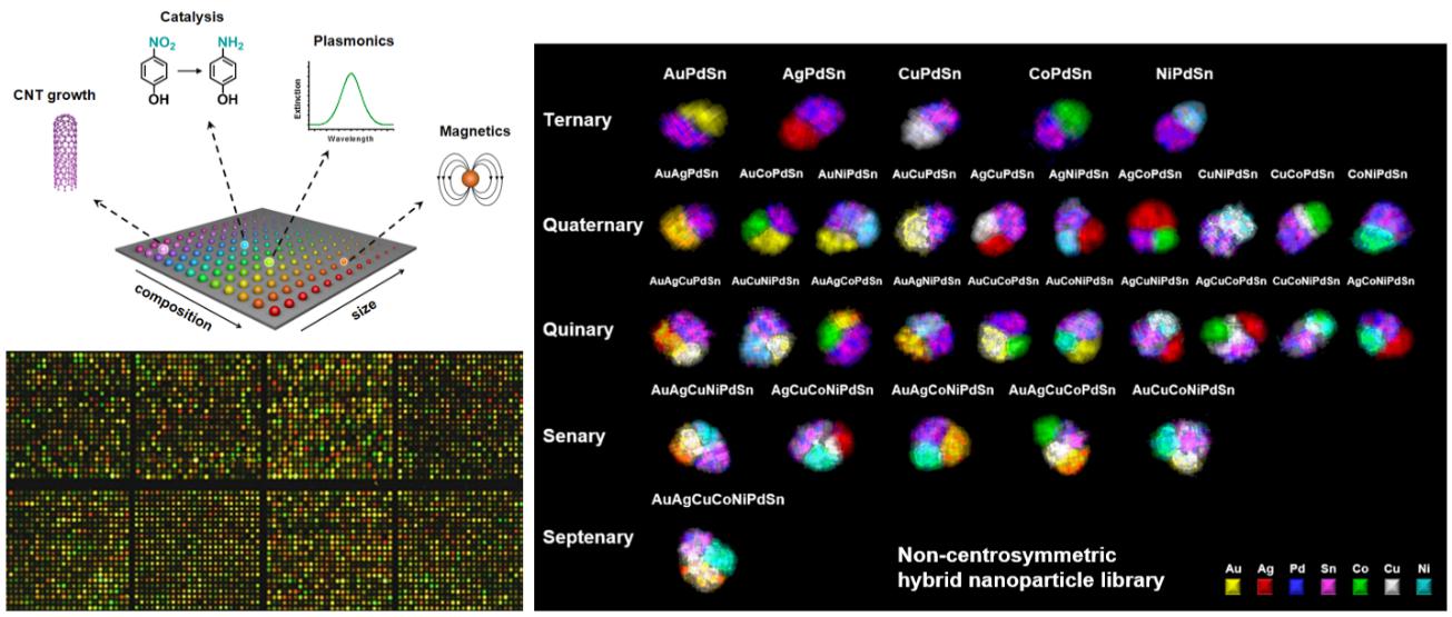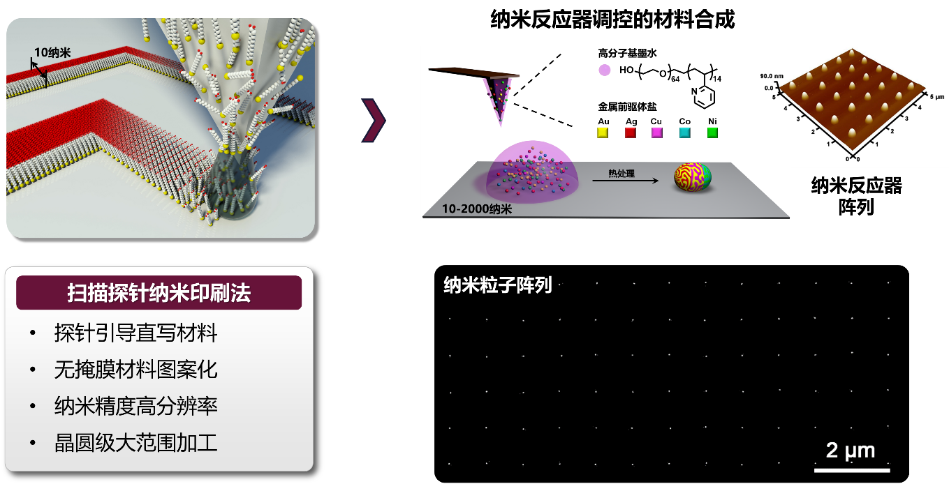 陈鹏程团队基于扫描探针技术和纳米反应器合成策略,建立起高效、普适的多元纳米粒子合成方法,实现了二元至多元纳米粒子的系统性制备和研究。团队通过扫描探针纳米印刷技术制备纳米液滴反应器,利用反应器的空间限域作用,将具备复杂相容性关系的多种元素束缚在极小尺度范围内形成多元纳米粒子。以金、银、铜、钴、镍五元体系为模型,成功合成了由这五种金属组成的所有组合方式的纳米粒子,在国际上首次实现多元纳米粒子的数据库式制备和组合研究。