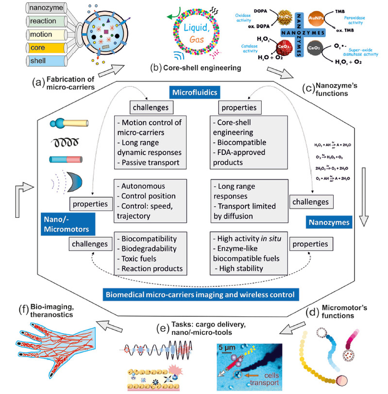 论文首先从微机械系统的推进机制和控制方法出发,总结了其在药物输送、显微外科以及解毒等方面的性能研究。在生物医学应用领域,微机械系统具有响应迅速、精确控制等优点,但在生物相容性、化学燃料毒性以及深层成像方面尚有一些不足。因此,目前的技术发展水平尚无法将生物化学机械微系统充分运用于临床医学,但引入纳米酶可以有效地弥补这一缺陷。纳米酶是具有催化功能的生物相容性纳米材料,其高稳定性和催化活性将有助于拓展化学机械系统的动力来源。论文详细介绍了纳米酶的分类、作用机制,并结合其优势和特性预见了其在智能微纳机械系统的潜在应用。通过微流控技术,研究人员可精密可控地合成具有多种功能的生物化学机械微系统,并在检测、成像和治疗中广泛应用。此外,论文还梳理了在生物化学机械微系统中具有生物深层成像功能的微胶囊和微泡的最新研究成果,以横跨多学科的视角总结了目前生物化学机械微系统的前沿进展、面临的挑战和机遇。最后,论文还对未来微机械系统的开发和及其生物医学应用进行了预测和展望。