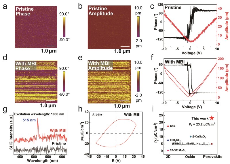采用压电原子力显微镜、铁电分析测试仪和二次谐波光谱证明引入MBI后锡基钙钛矿产生铁电性