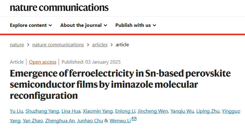 文章信息:Yu Liu, Shuzhang Yang, Lina Hua, Xiaomin Yang, Enlong Li, Jincheng Wen, Yanqiu Wu, Liping Zhu, Yingguo Yang, Yan Zhao, Zhenghua An, Junhao Chu, and Wenwu Li*, Emergence of ferroelectricity in Sn-based perovskite semiconductor films by iminazole molecular reconfiguration.Nature Communications, 2025, 16, 365.