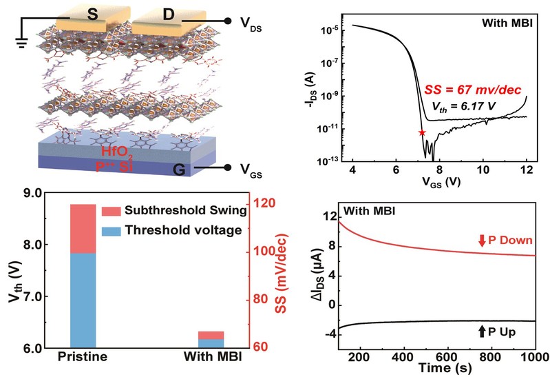 基于这一发现,研究团队进一步将掺MBI分子的锡基铁电钙钛矿应用于铁电场效应晶体管(FeFET)中,开发了底栅顶接触结构的器件。实验结果显示,掺MBI后的FeFET展现出显著的铁电滞回现象,而随着MBI浓度的增加,器件的亚阈值摆幅(SS)从120 mV/dec降至67 mV/dec,表明该材料在低压操作和低功耗器件中的巨大潜力。这一创新性进展不仅推动了钙钛矿半导体领域的发展,更为未来低功耗、高效能电子器件的设计提供了新的思路。